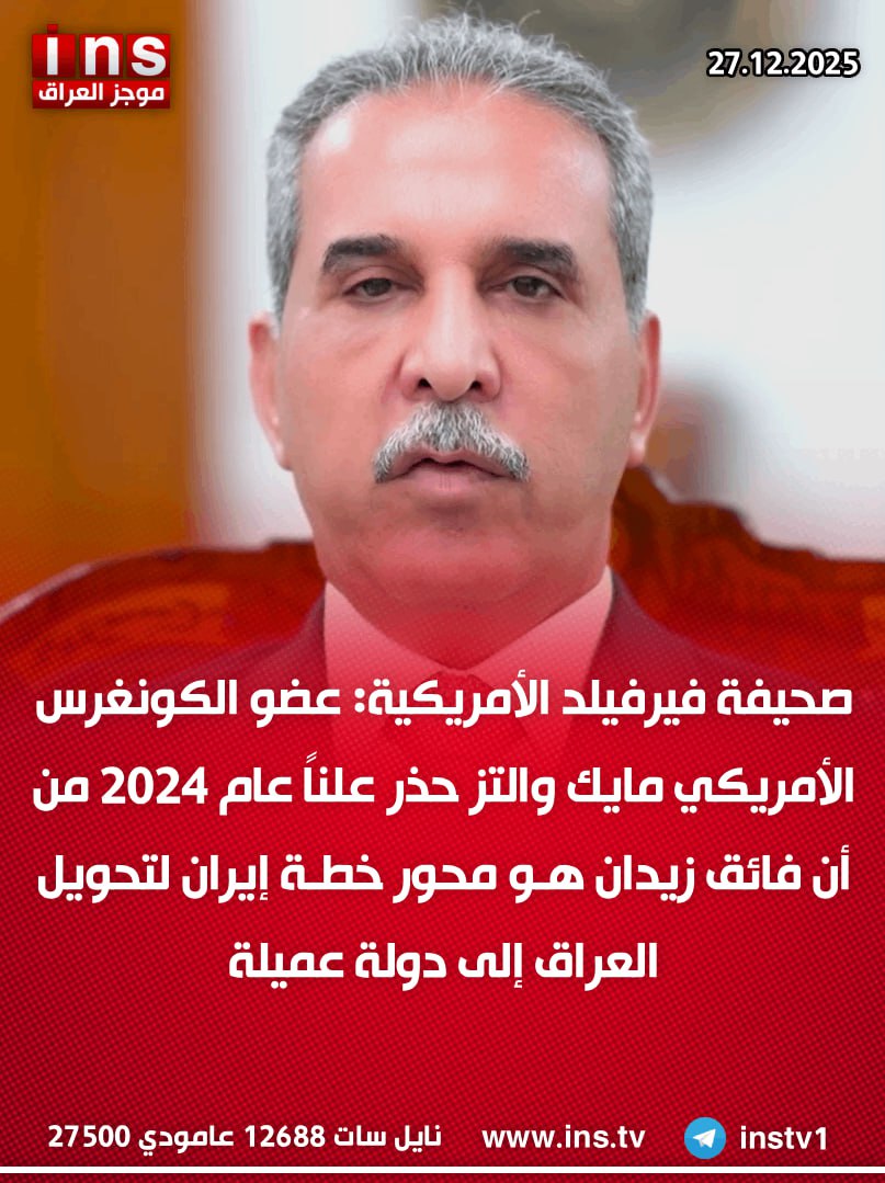 الرئيسيةالأخبارصحيفة فيرفيلد الأمريكية: عضو الكونغرس الأمريكي مايك والتز حذر علناً عام 2024... الأخبار صحيفة فيرفيلد الأمريكية: عضو الكونغرس الأمريكي مايك والتز حذر علناً عام 2024 من أن فائق زيدان هو محور خطة إيران لتحويل العراق إلى دولة عميلة 0 59 ديسمبر 27, 2025 كتب بواسطة موجز العراق ins شارك FacebookTwitterPinterestWhatsAppTelegramViberCopy URL شارك FacebookTwitterPinterestWhatsAppTelegramViberCopy URL مقالات ذات صلة الأخبار صحيفة فيرفيلد الأمريكية: مذكرة القبض بحق الرئيس ترامب التي اصدرها فائق زيدان لم تكن إجراءً قانونياً حقيقياً، بل رسالة سياسية تعزز مكانته داخل المحور... ديسمبر 27, 2025 الأخبار صحيفة فيرفيلد الأمريكية: أظهر فائق زيدان ولاءً رمزياً واضحاً لسليماني والمهندس، من خلال نصب تمثال للمهندس في منزله، وإصداره مذكرة توقيف بحق الرئيس الأمريكي... ديسمبر 27, 2025 الأخبار صحيفة فيرفيلد الأمريكية نقلاً عن ضابط رفيع في المخابرات العراقية: العراق خضع لسيطرة شبكة واحدة يقودها فائق زيدان، وهو الرجل الذي وضعته إيران في... ديسمبر 27, 2025