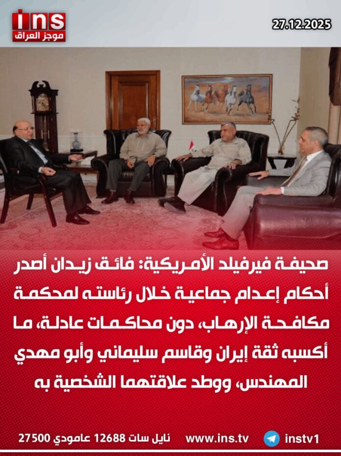 صحيفة فيرفيلد الأمريكية: فائق زيدان أصدر أحكام إعدام جماعية خلال رئاسته لمحكمة مكافحة الإرهاب، دون محاكمات عادلة، ما أكسبه ثقة إيران وقاسم سليماني وأبو مهدي المهندس، ووطد علاقتهما الشخصية به