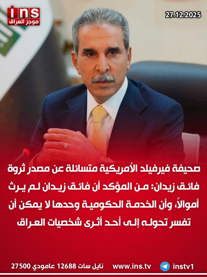صحيفة فيرفيلد الأمريكية متسائلة عن مصدر ثروة فائق زيدان: من المؤكد أن فائق زيدان لم يرث أموالاً، وأن الخدمة الحكومية وحدها لا يمكن أن تفسر تحوله إلى أحد أثرى شخصيات العراق
