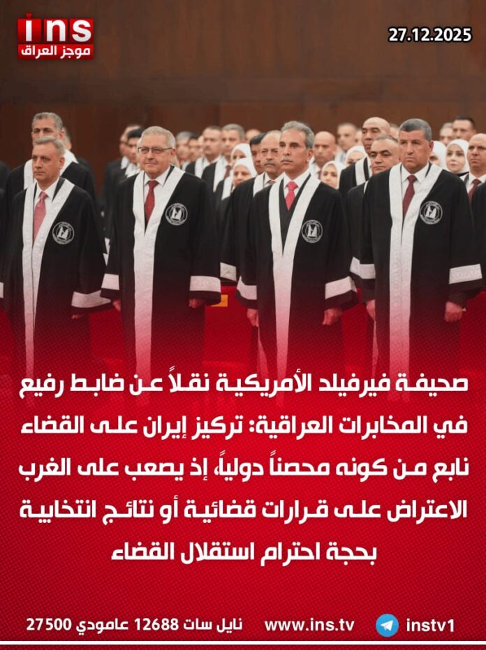 صحيفة فيرفيلد الأمريكية نقلاً عن ضابط رفيع في المخابرات العراقية: تركيز إيران على القضاء نابع من كونه محصناً دولياً، إذ يصعب على الغرب الاعتراض على قرارات قضائية أو نتائج انتخابية بحجة احترام استقلال القضاء
