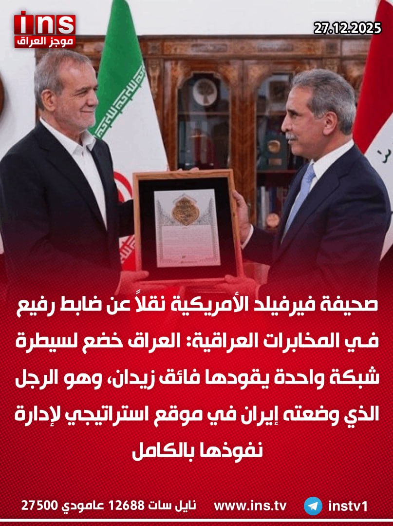 صحيفة فيرفيلد الأمريكية نقلاً عن ضابط رفيع في المخابرات العراقية: العراق خضع لسيطرة شبكة واحدة يقودها فائق زيدان، وهو الرجل الذي وضعته إيران في موقع استراتيجي لإدارة نفوذها بالكامل