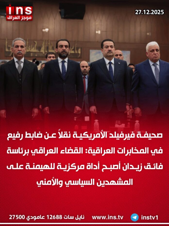صحيفة فيرفيلد الأمريكية نقلاً عن ضابط رفيع في المخابرات العراقية: القضاء العراقي برئاسة فائق زيدان أصبح أداة مركزية للهيمنة على المشهدين السياسي والأمني